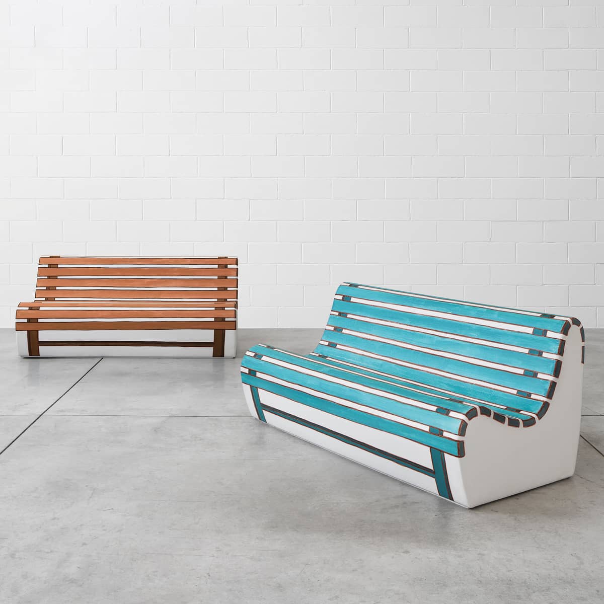 SUMMERTIME e AUTUMNTIME di Valerio Berruti si ispirano ai suoi dipinti che ritraggono la piccola e sfuggente bellezza della vita quotidiana. I due divani gemelli dipinti a mano si ispirano al caldo dell’estate e alla fresca brezza autunnale. Abbastanza spaziosi da ospitare tre persone, questi divani evocano le rispettive stagioni anche nella scelta dei colori: con SUMMERTIME nei toni dell’acquamarina e AUTUMNTIME nei caldi toni del miele.